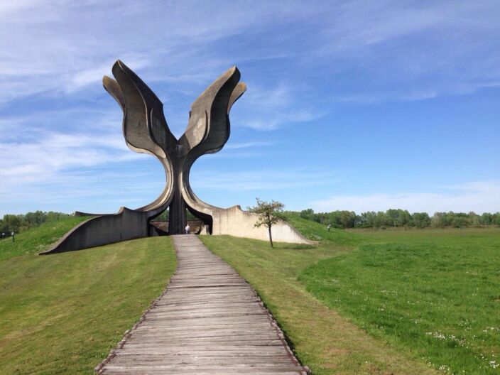 Leider gibt es keinen direkten Flug mehr nach Banja Luka. So reisten Gerhard und ich einen Tag vor der Gruppe über Zagreb, wo wir von Helen Jäggi Kosic abgeholt wurden. Auf der Fahrt nach Laktasi kamen wir am ehemaligen Konzentrationslager in Jasenovac vorbei. Es war während dem 2. Weltkrieg das grösste Sammel-, Arbeits-, Konzentrations- und Vernichtungslager im faschistischen unabhängigen Staat Kroatien. Wegen seiner Grösse wurde es auch „Auschwitz des Balkan“ genannt. Serben, Juden, Roma und Regimekritiker – Männer, Frauen und Kinder – wurden hier von Mitgliedern der Ustascha, einem kroatisch, rechtsextrem-terroristischen Geheimbund, eingesperrt, weiter in die KZs von Deutschand deportiert oder mit Messern, Hacken, Beilen und Äxten grausamst umgebracht. Der Lagerkomplex bestand aus 8 Nebenlagern, davon drei allein für Kinder bestimmt. Welch entsetzliche Abgründe!