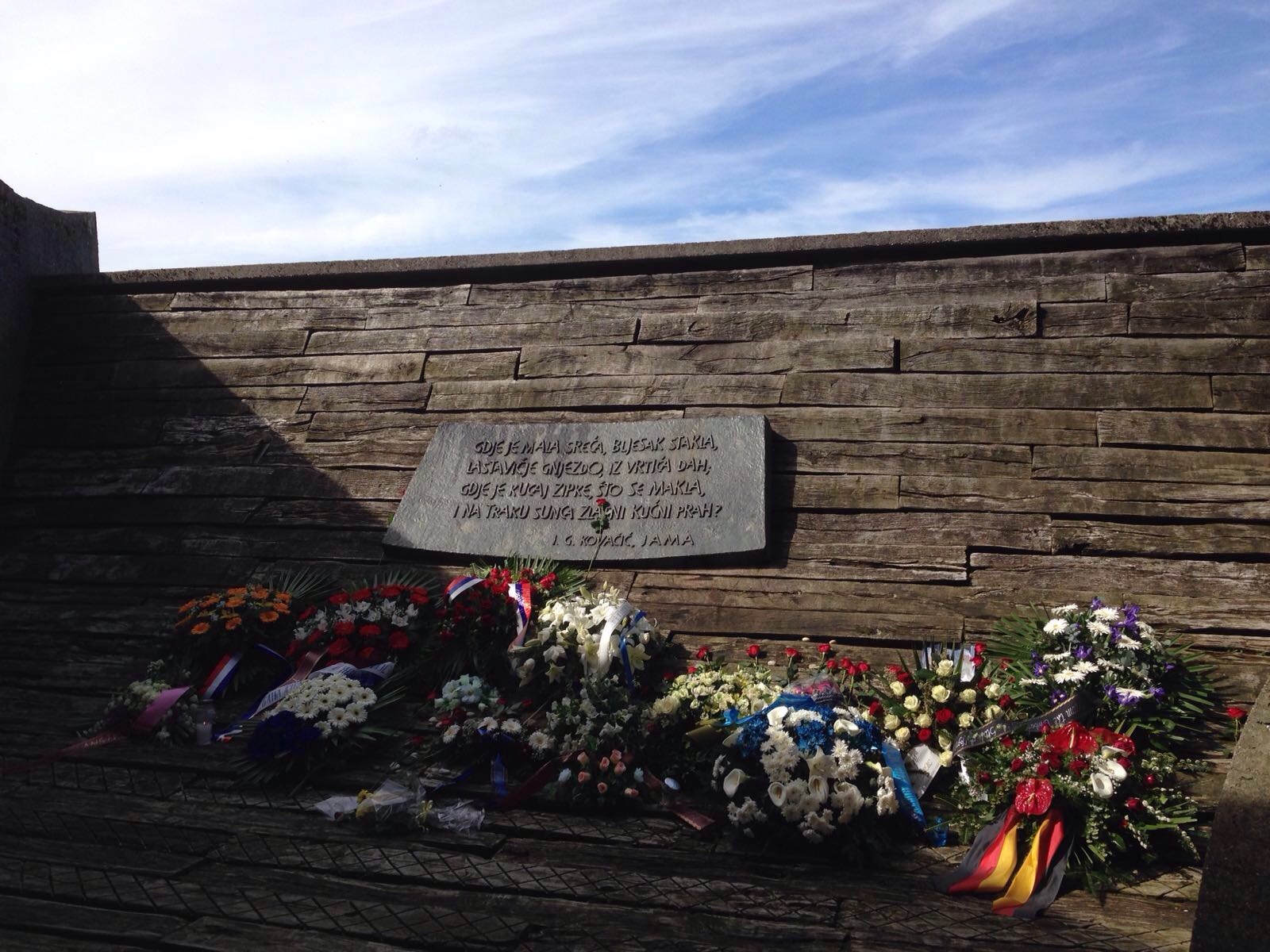 Heute besuchten wir die Gedenkstätte auf kroatischem Boden. Schon von weitem war die steinerne Blume zu sehen. Sie wurde im Gedenken an die Opfer des KZs während Titos Zeit errichtet. Das satte Grün des Frühlings legt sich wie ein zärtlicher Mantel über das Gelände. Die Blumenkränze im Denkmal erinnern an den Besuch einer internationalen Delegation. Sie sind auch aus Israel angereist. Ein Kranz ist für einen ermordeten Vater bestimmt. Hier ist die Atmosphäre düster und kalt. Helen, Gerhard und ich visualisieren heilendes, göttliches Licht. Leise beginnt Gerhard zu singen: Erd und Himmel zu verbinden, bist gerufen du oh Mensch. Das gemeinsame Singen tut uns selber gut, befreit den Ort von erdrückender Schwere und erhellt unsere innere Stimmung.